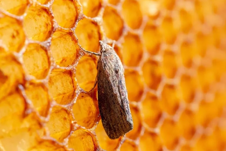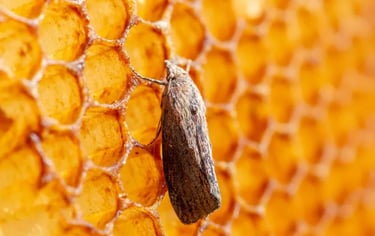 Wax moths are a common pest in beehives, causing damage to comb, honey, and brood. They lay their eggs near beehives or on stored beekeeping equipment. Once hatched, the larvae burrow into beeswax comb, where they feed and develop. The larvae spin silken webs as they tunnel through the comb, causing structural damage and contaminating stored honey.